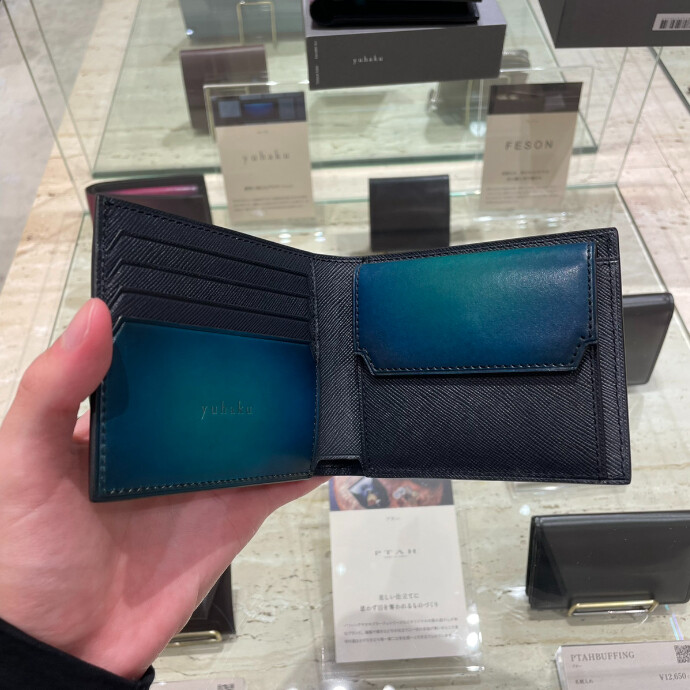 きめ細かなカーフスキンにyuhaku染色職人が手染めを施し、不透明であるはずの革素材に透明度の高い美しいツヤを生み出しました。