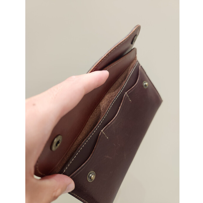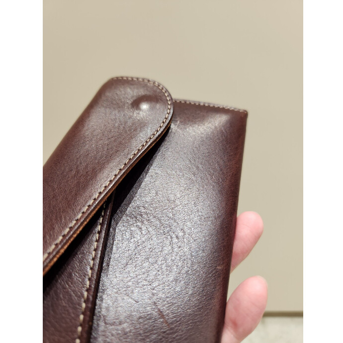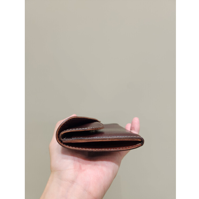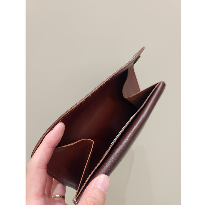 小銭ポケットが大きくひらくギャルソン型で取りやしだすさが抜群。 ボタンは革の中に隠されており、シンプルながらフロント部のダブルフラップデザインが唯一無二の雰囲気です。 経年変化も楽しめる革にも注目。 31,000円(税込み)