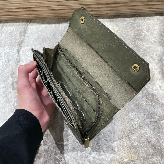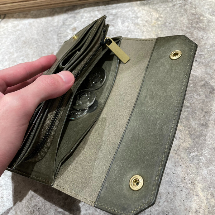 ビアベリーおじさんの刻印がある部分に小銭を投げ込むと、手前のファスナーポケットへ自然と流れ込む独自の設計を持ち、お釣りをサッと収納出来て操作感も楽しいです。