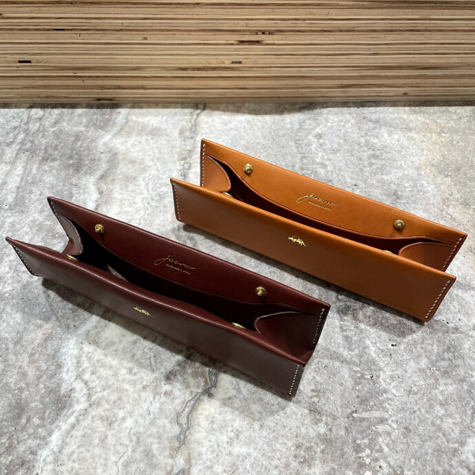 箔押しされた金色のロゴ、ボタン開閉式によるスリムなフォルム、リネン糸の温かみのある風合いなど、随所にこだわりを感じることができるペンケース。 上質なイタリアンレザーを使用しています。 ¥19,800(税込)