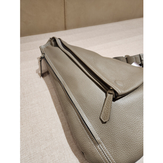 口折れタイプのデザインをテーマに、シンプルで素材感をいかしたボディバッグです。アシンメトリーな形状ですが、フラップを表裏折り変え、ショルダーベルトを表裏差し替えることで、左右どちらの肩でも持っていただける両面使用のデザインです。表のフラップを起こすと、スマホがちょうど収まるポケットが付きます。ショルダーベルトにもレザーを使い、レザーの質感を存分に楽しんでいただける贅沢なバッグです。