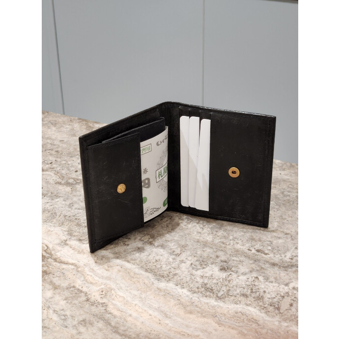 カード段は幅広く設計されているので取り出しやすく、最大で5枚~7枚ほど収納出来ます。小銭入れ部分はマチが付いているので大きく開いてくれ、小銭入れの上のパーツによって、小銭も落ちにくくなっています。また、お札収納も幅が広いのでスムーズに出し入れができるコンパクトな二つ折り財布です。