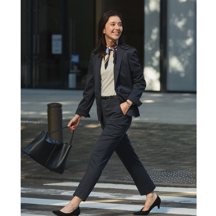 伸縮性の⾼いパンツはたくさん歩く⽇にも動きやすく、シルエットもスマート。
