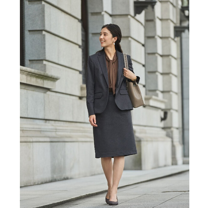 リッチな雰囲気漂う、ブラウンのテーラードジャケットのスーツ。 ウール⾒えするメランジ柄をプリントで表現し、ジャージー⽣地とは思えないほど⾼級感のある仕上がり。