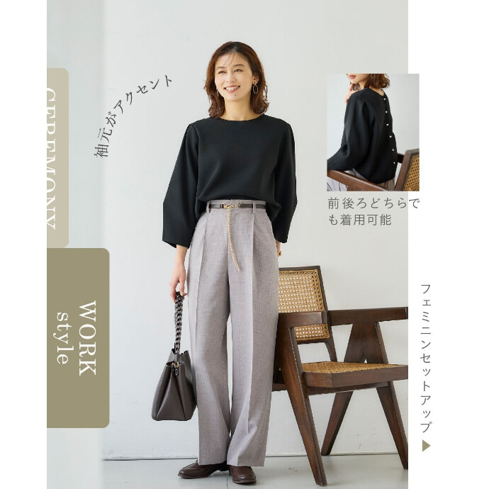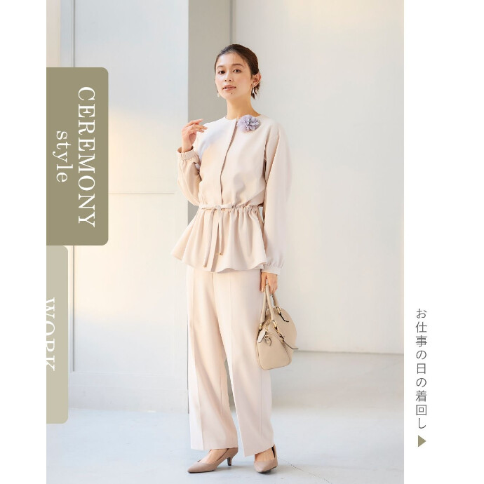ほどよく甘さのあるコーディネートで、式典やきちんとした場面はもちろん、通勤や打ち合わせにも活躍。