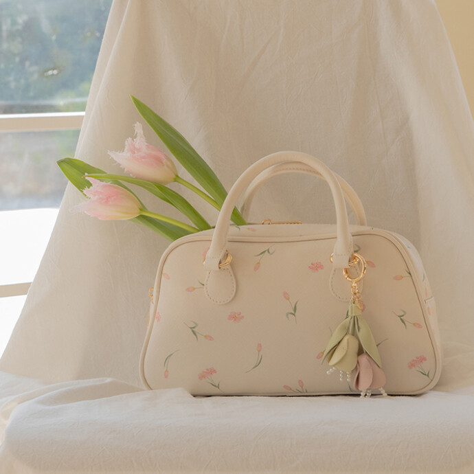 春らしいチューリップデザインが目を惹くハンドバッグ。