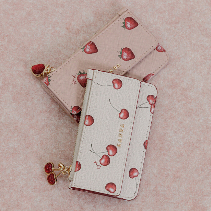チェリーとストロベリーのオリジナルプリントが目を惹くウォレット。