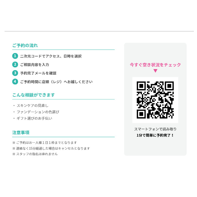 コスメ選びの相談など接客の予約が事前にできるので、