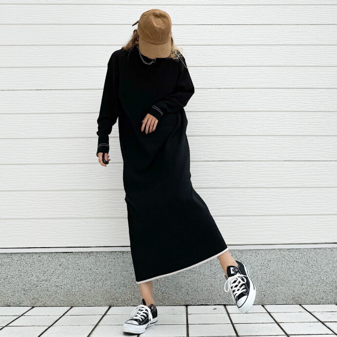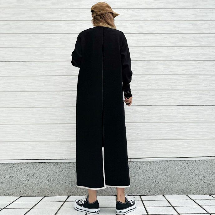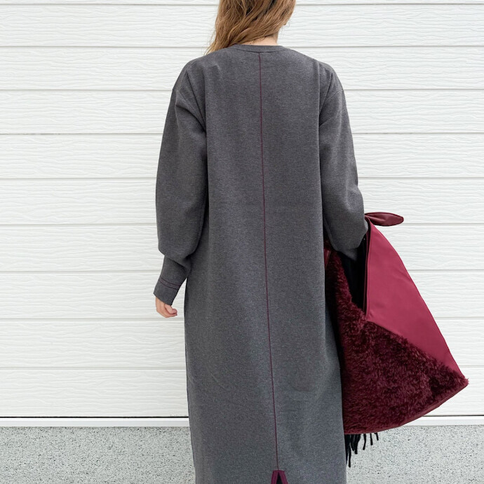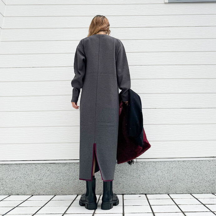 後ろ中央やスリット部分、袖や裾にバイカラーラインを施し、シンプルながらもさり気ないアクセントのある一着に。