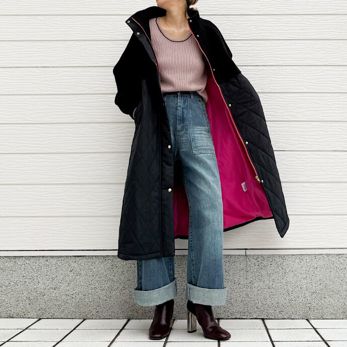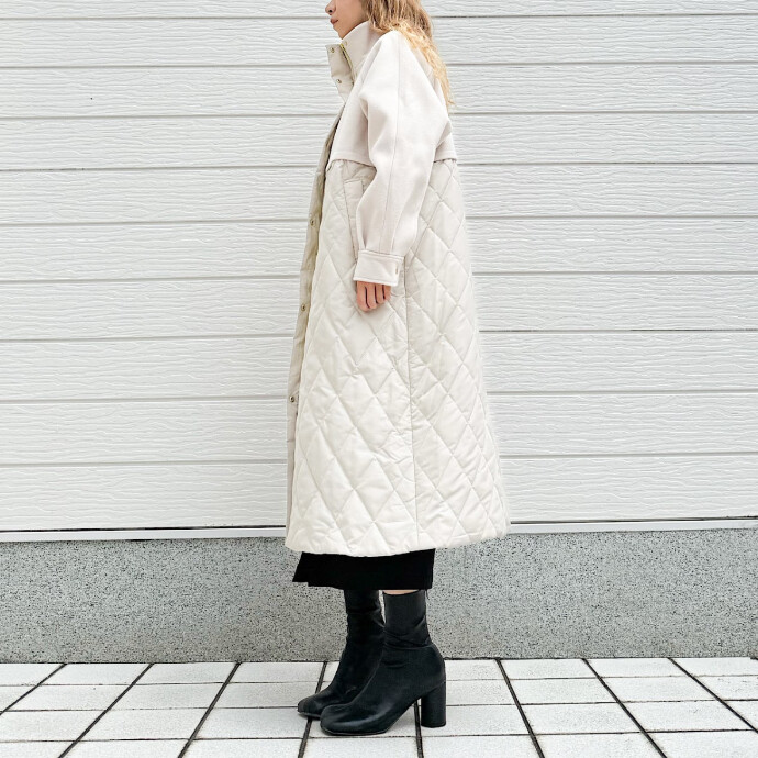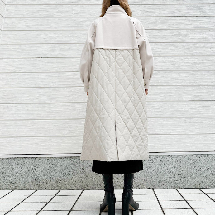 上品なう布帛とダイヤキルティングを組み合わせた、モードな表情のロングコートです。