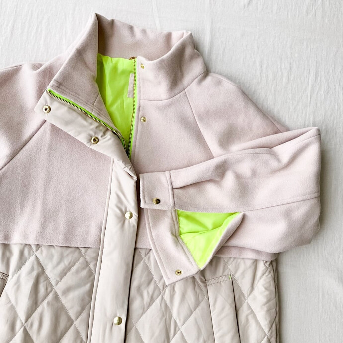 フロント部分はジップとスナップボタン仕様で、モード感のある仕上がりに。