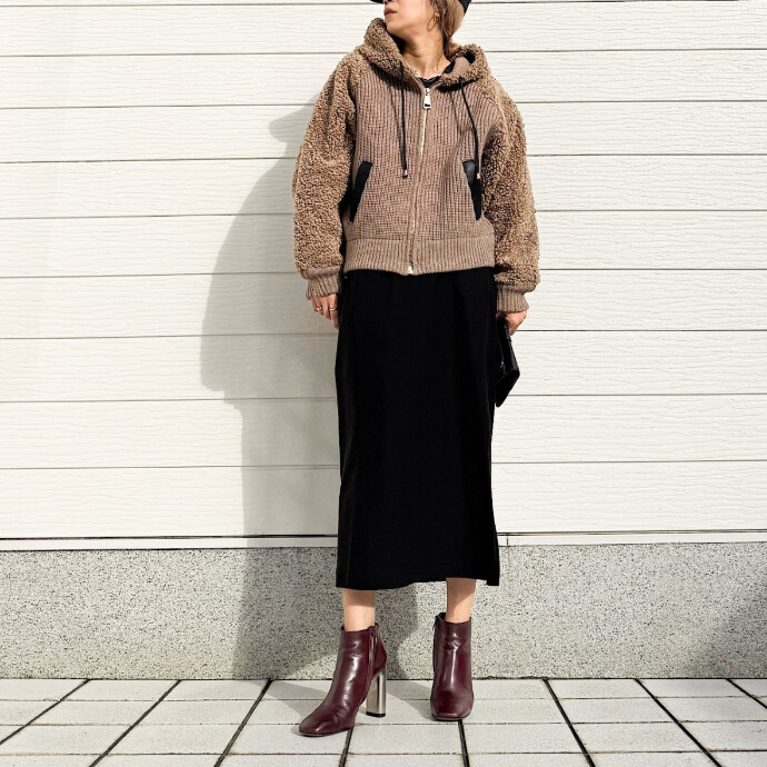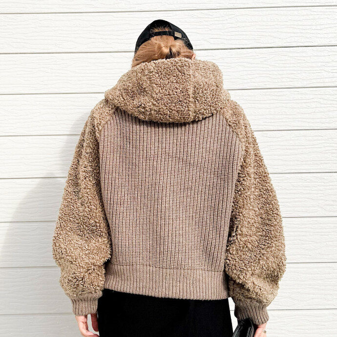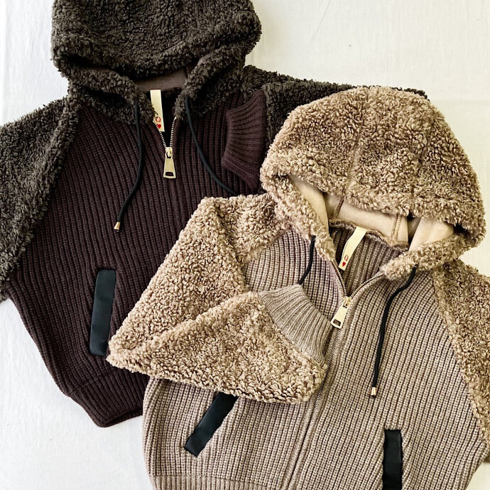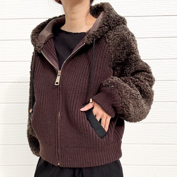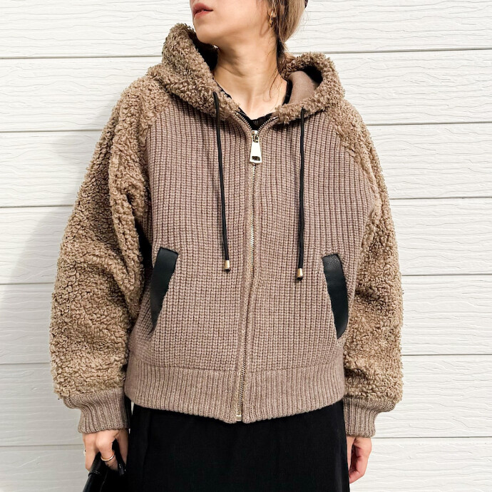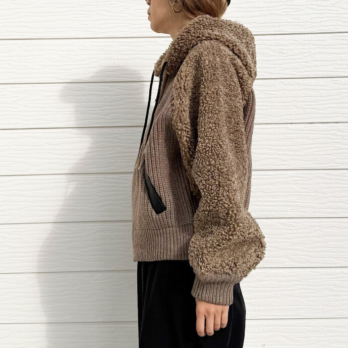 ふわふわなボアとリブニットの切り替えデザインがパーカー表情をプラスしてくれます。