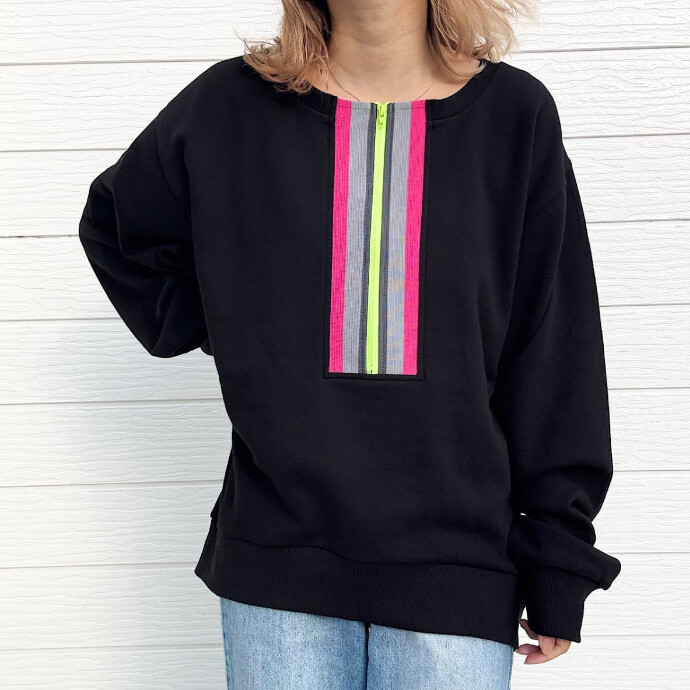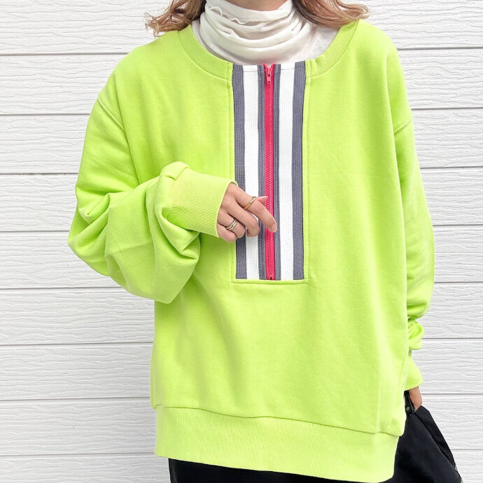 カラーファスナーと配色のリブが特徴的で、個性あふれるスタイルを楽しむことができます。