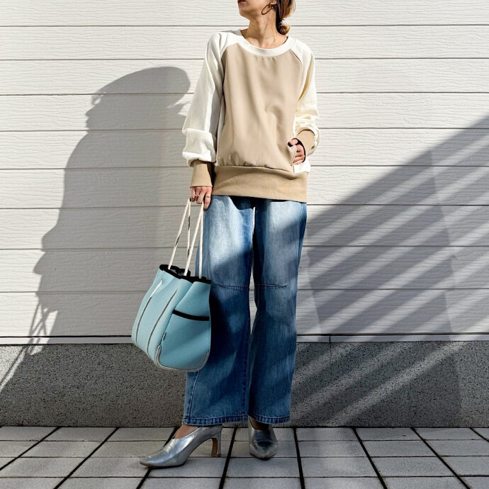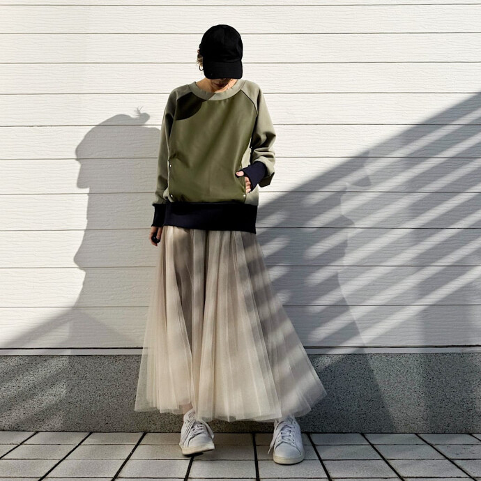 シンプルな形ながら素材の切り替えがスタイリングに華やかさをプラスし、着るだけでコーデが決まります。