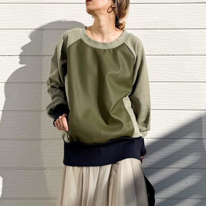 フロントには上品な艶感のフェイクレザー、袖や後ろ身頃には裏毛素材を使用し、きれいめとカジュアルをバランスよく融合した1枚です。
