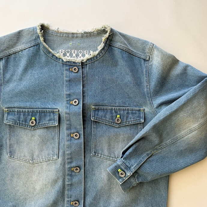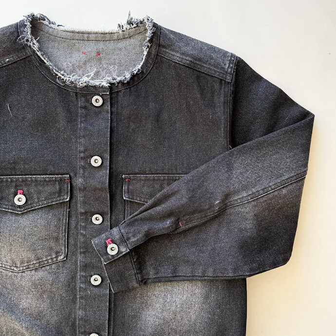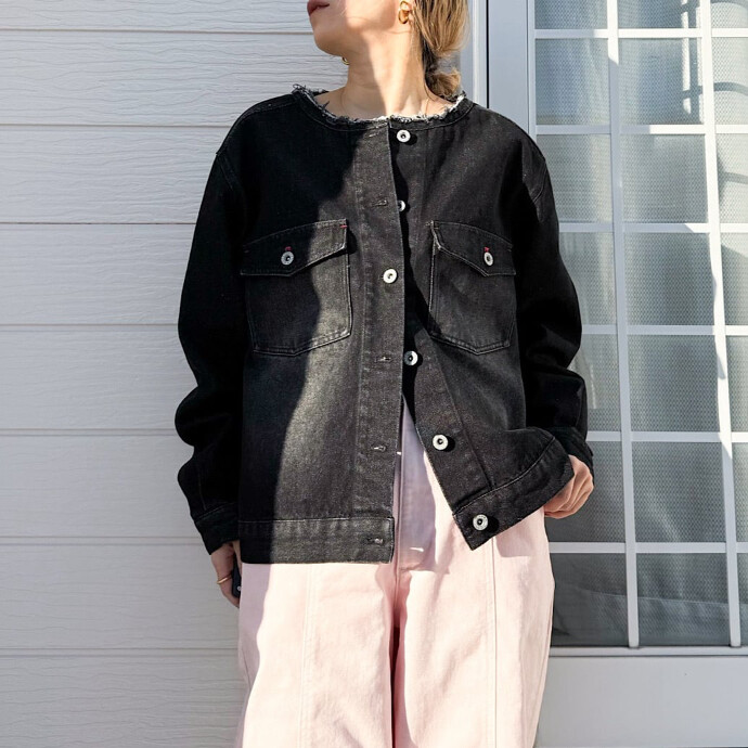 襟なしのノーカラーで切りっぱなしのデザインが1枚でこなれた雰囲気を演出します。