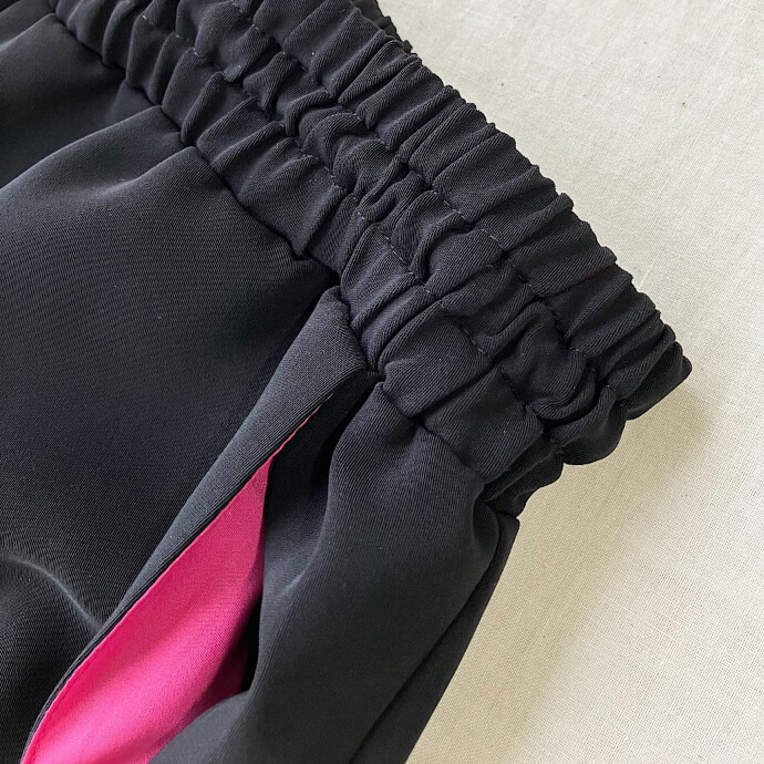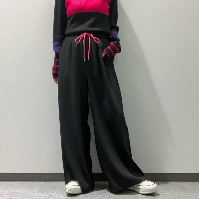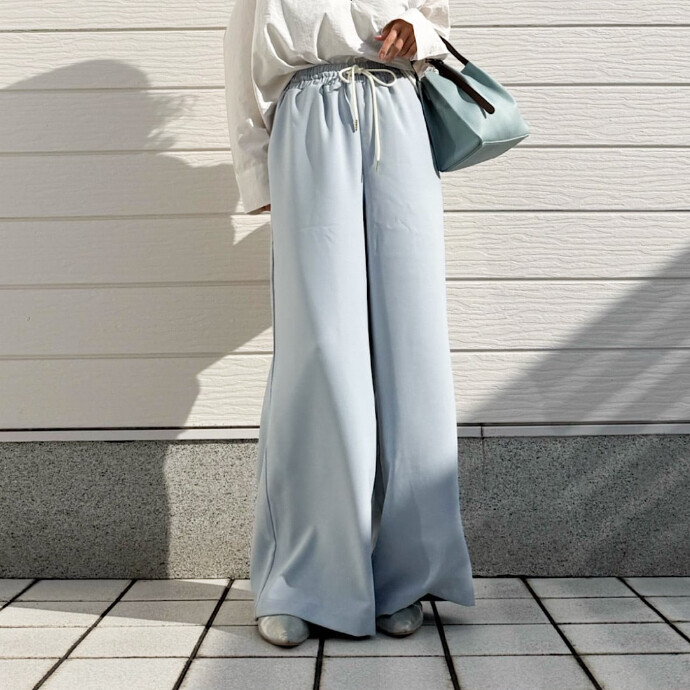 ほどよい落ち感ときれいなワイドラインが魅力のウエストギャザーパンツです。