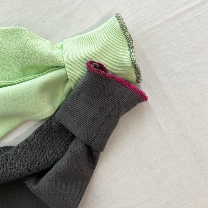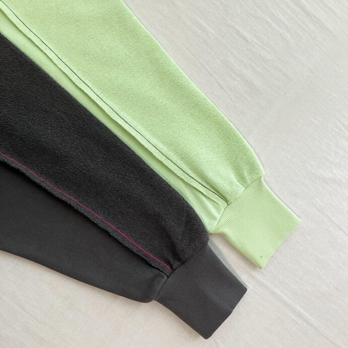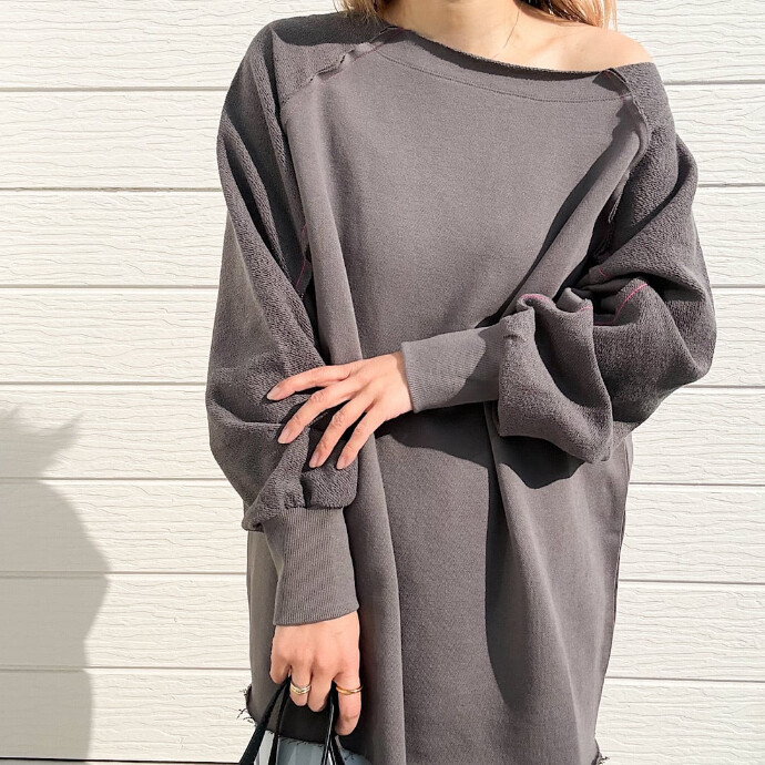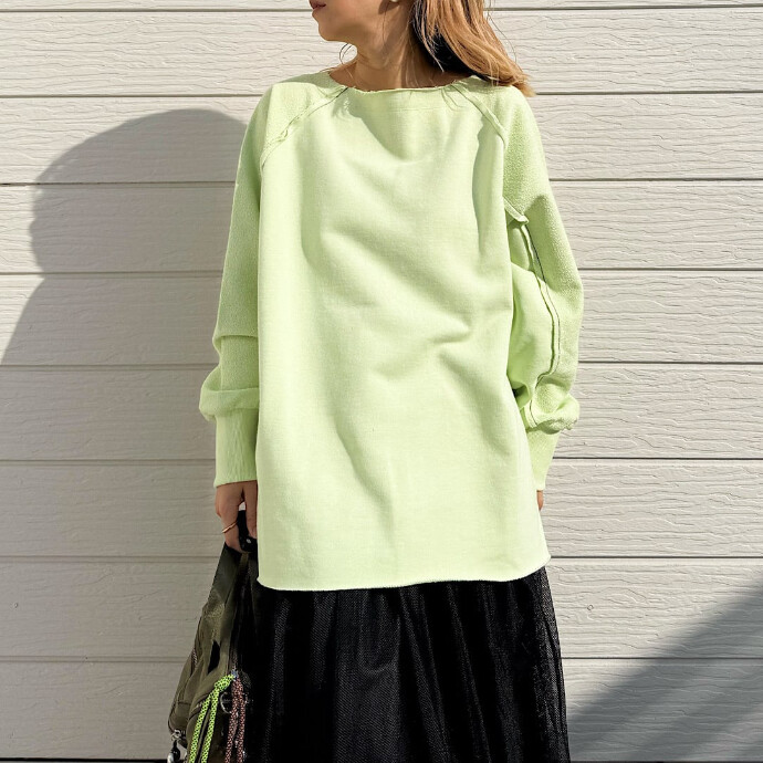ラグラン切り替えでお袖から下は裏の生地をテレコで使用している軽めの裏毛トップスです。