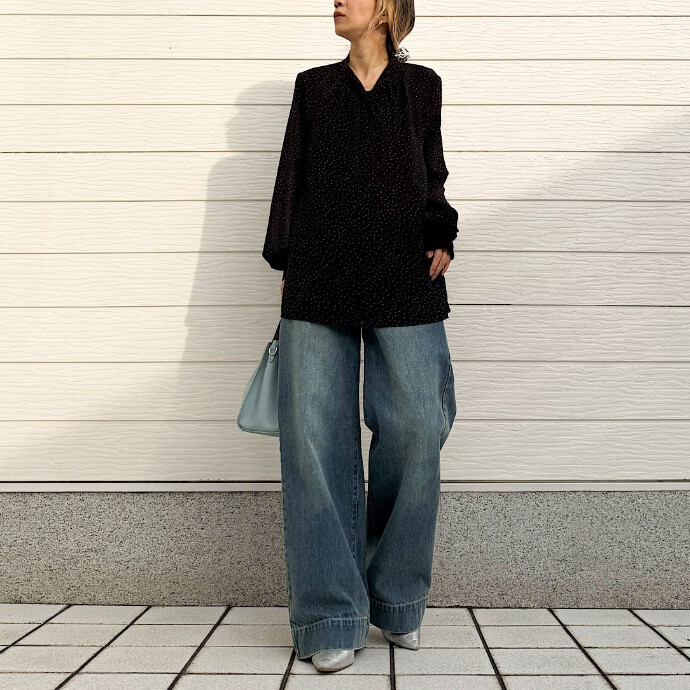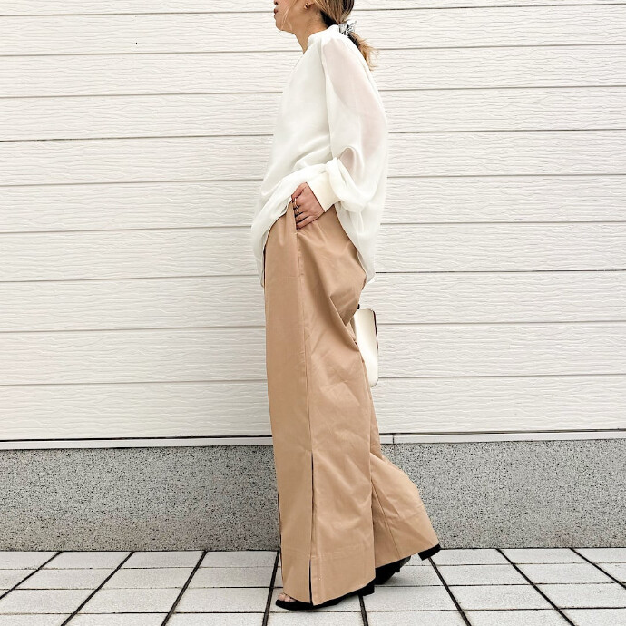 一見きれいめに見えるブラウスですが、お袖にリブがついているのできちんとし過ぎず、抜け感を出しながら気軽に着ていただけます。