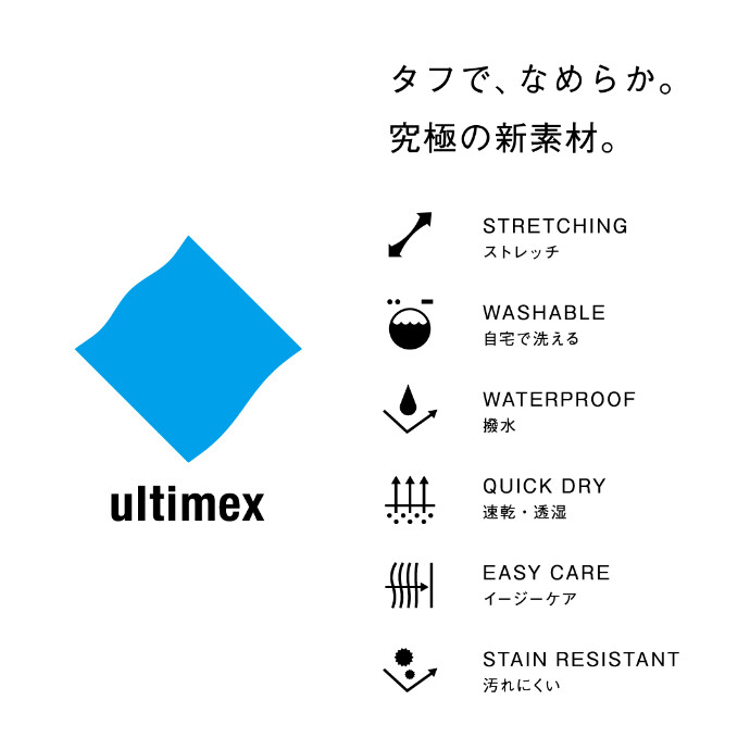 オリジナル素材「ultimex/アルティメックス」を使用し、汚れに強く、撥水・速乾・ストレッチ、シワになりにくく、毎日洗える耐久性と機能面に優れています。